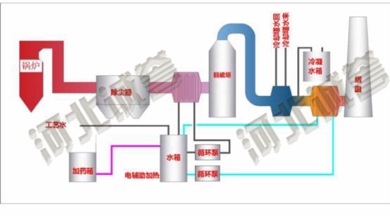 在MGGH基础之上,在脱硫塔出口增设烟气冷凝系统对烟气直接降温,使饱和烟气中水蒸汽冷凝并在烟道中捕集下来,收集的冷凝水,进行简单处理后即可进入FGD系统使用。冷源:江、河、湖、海水等自然冷源,循环冷却水,强制通风冷却塔。